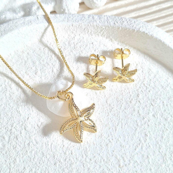 Set en rodio, cadena ajustable con dije en forma de estrella de mar y topos a juego