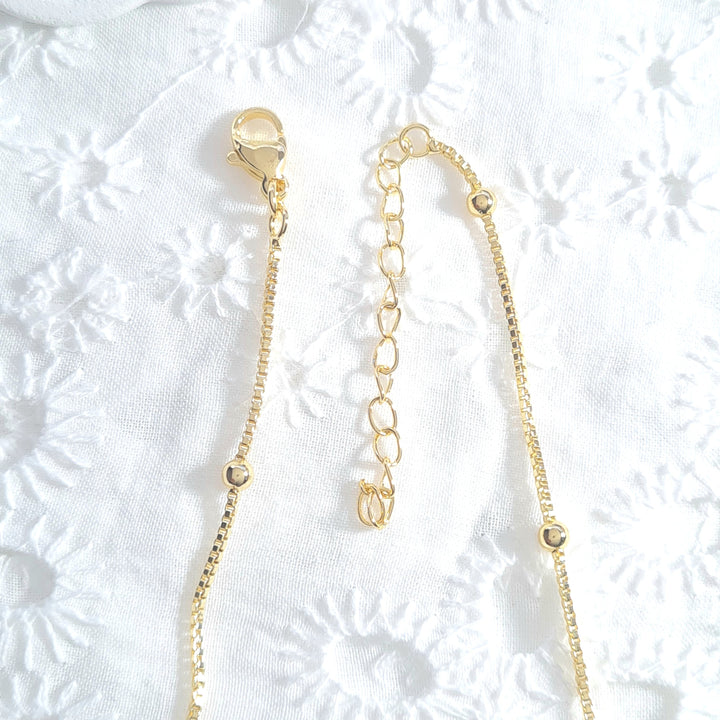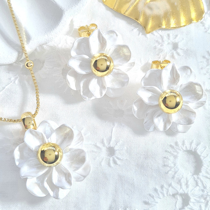 Set en rodio, dije en forma de flor blanca y topos a juego