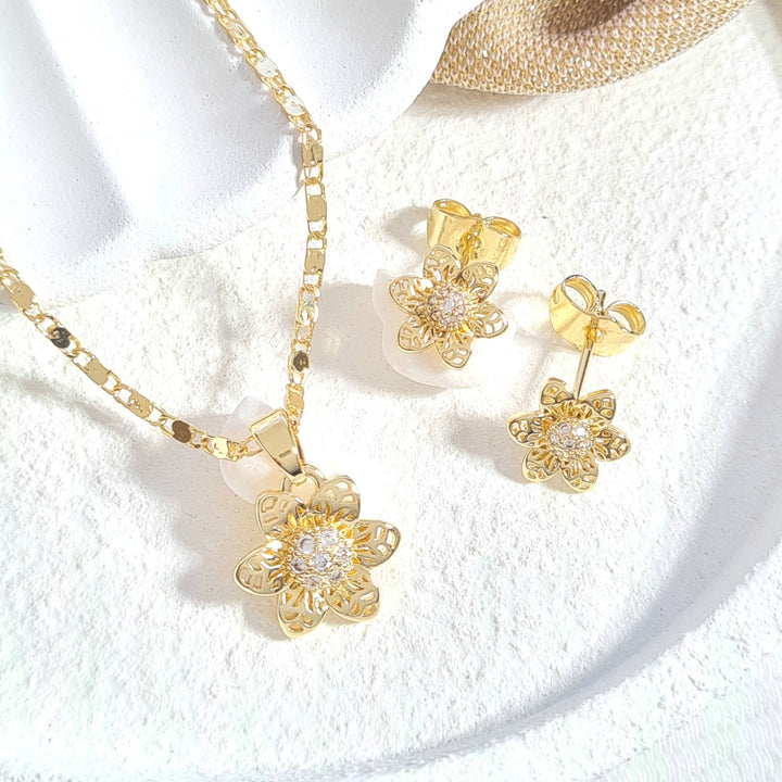 Set en rodio, dije en forma de flor, detalles en zircones y topos a juego