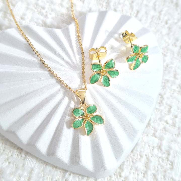 Set en rodio, dije en forma de flor verde y topos a juego