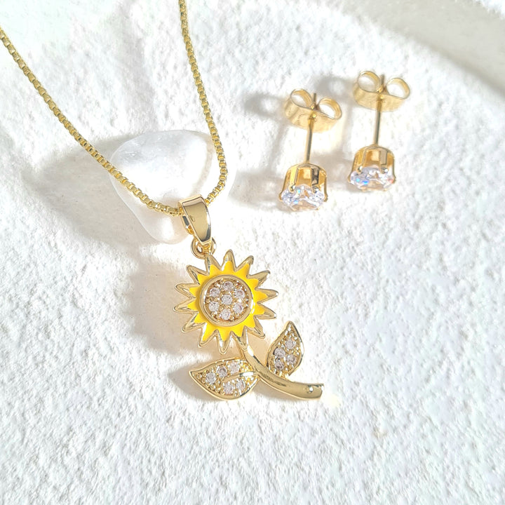 Set en rodio, cadena ajustable, dije en forma de girasol, detalles en zircones y topos a juego