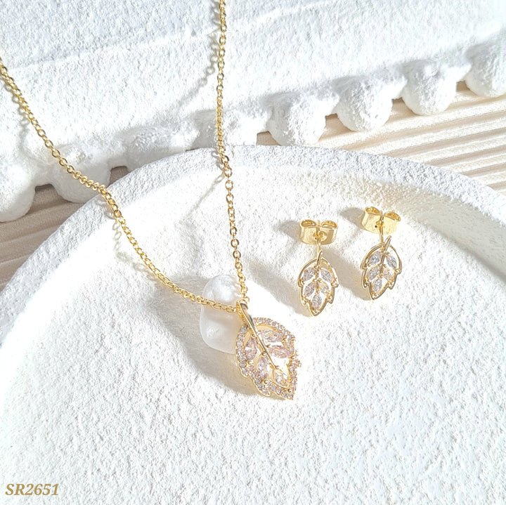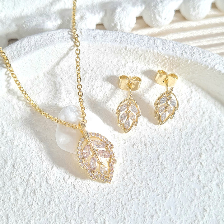 Set en rodio con dije en forma de hoja, detalles en zircones y topos a juego