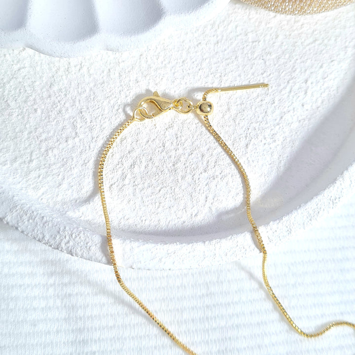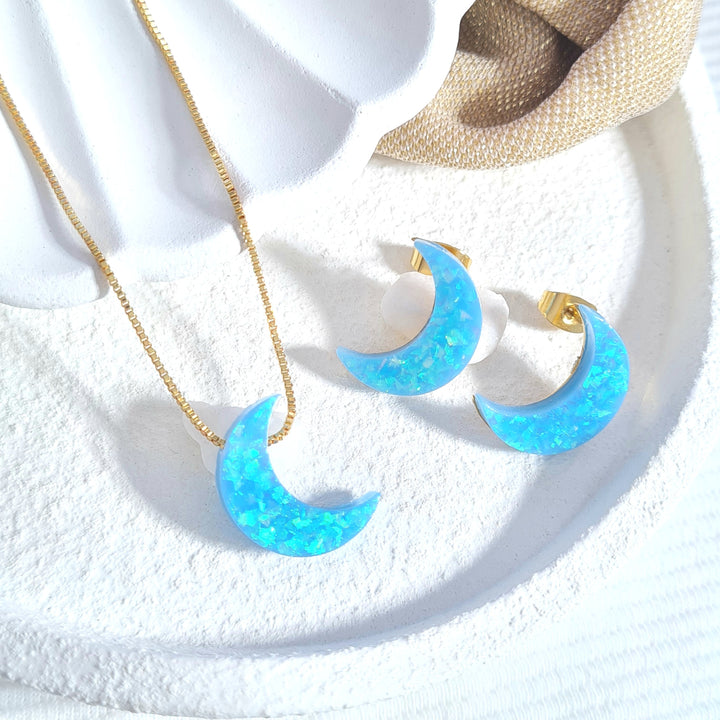Set en rodio, cadena ajustable dije en forma de luna azul tornasol y topos a juego