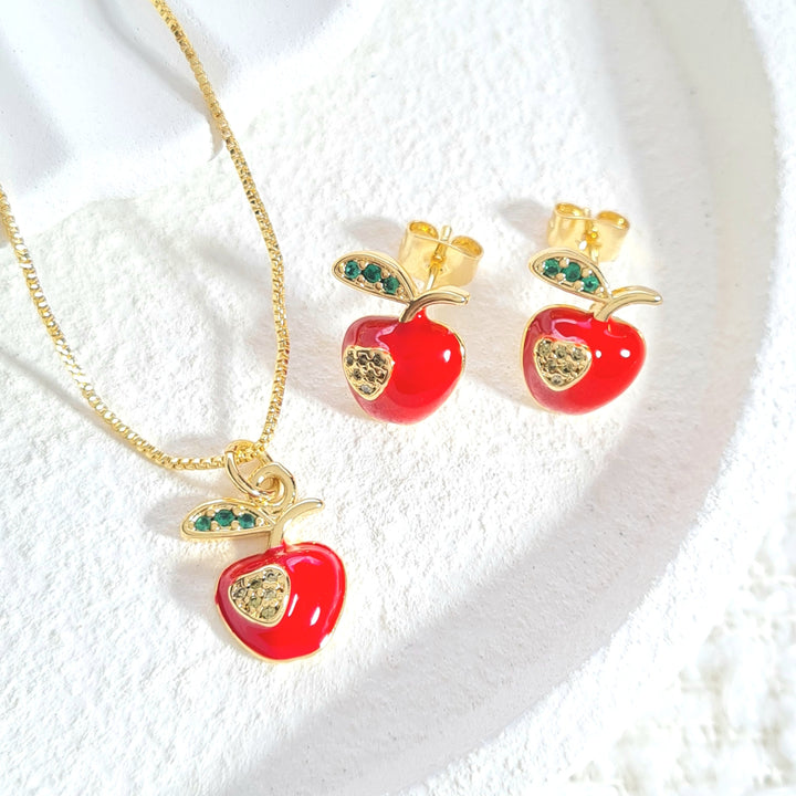 Set en rodio, cadena ajustable, dije en forma de manzana roja, detalles en zircones y topos a juego