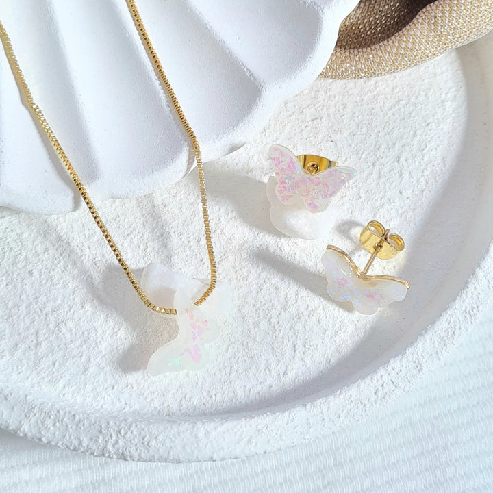 Set en rodio, cadena ajustable, con dije en forma de mariposa en tornasol blanco y topos a juego