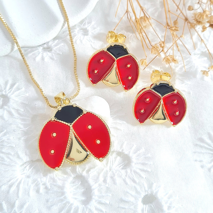 Set en rodio, cadena ajustable con dije en forma de mariquita y topos a juego