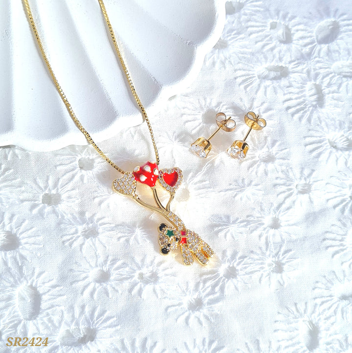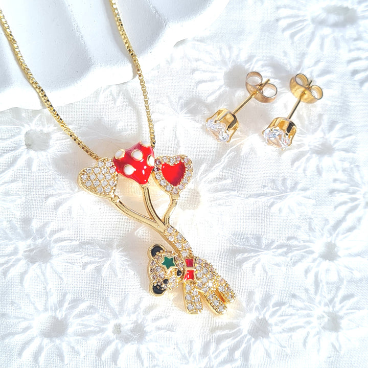 Set en rodio, cadena ajustable, dije en forma de oso con globos rojos y topos a juego