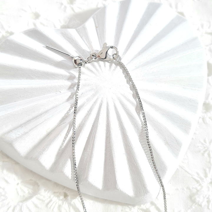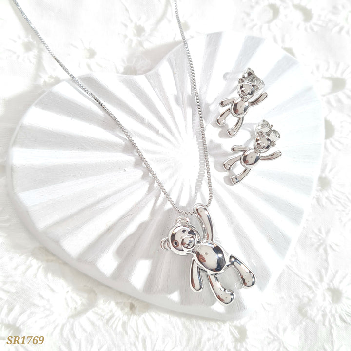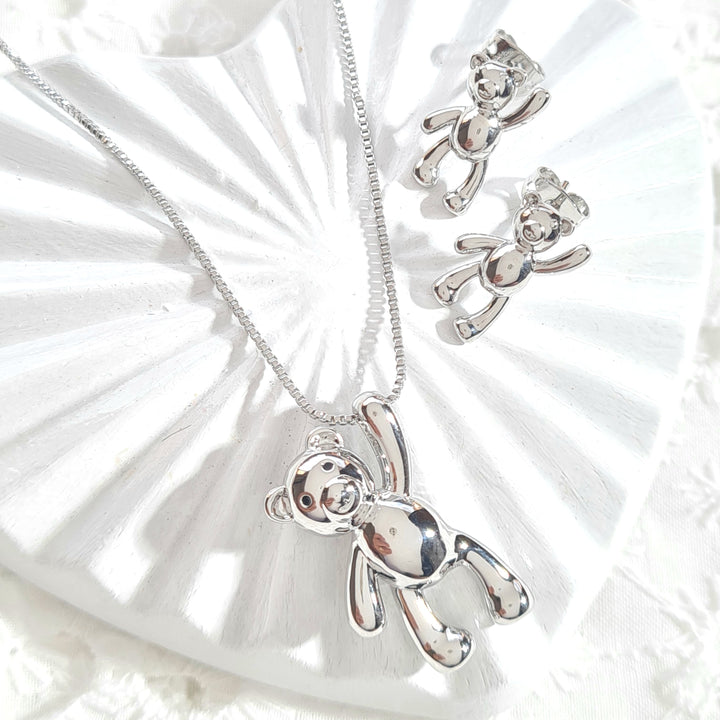 Set en rodio plateado, cadena ajustable, dije en forma de oso y topos a juego