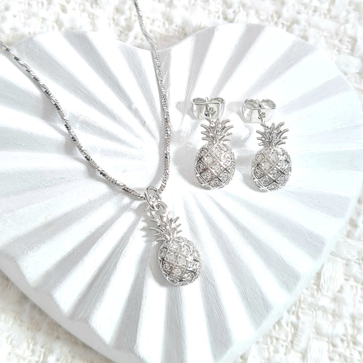 Set rodio plateado, cadena ajustable con dije en forma de piña y topos a juego