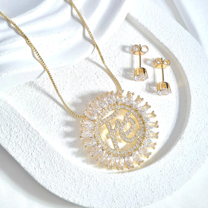 Set en rodio, cadena ajustable, dije redondo con palabra "fé", detalle en zircones y topos zircón