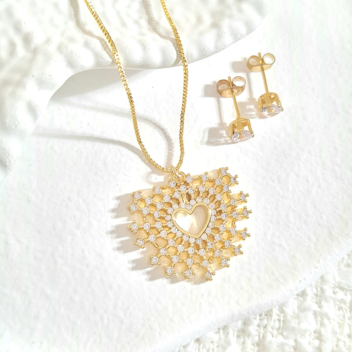 Set en rodio con cadena ajustable, dije en silueta de corazón con zircones al rededor y topos zircón
