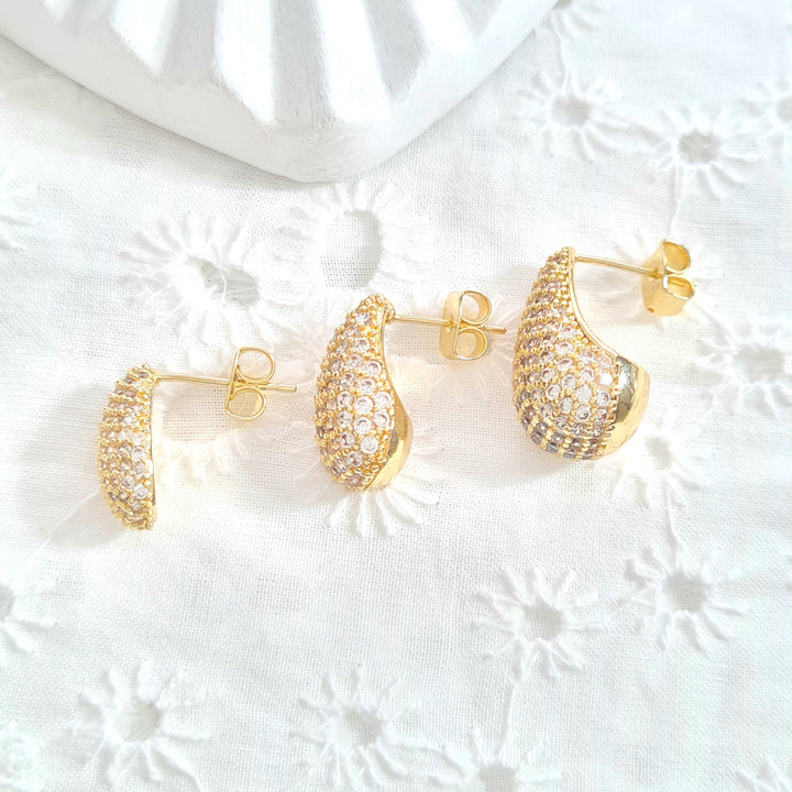 Set de topos en rodio con forma de gota tres tamaños y detalles en zircones
