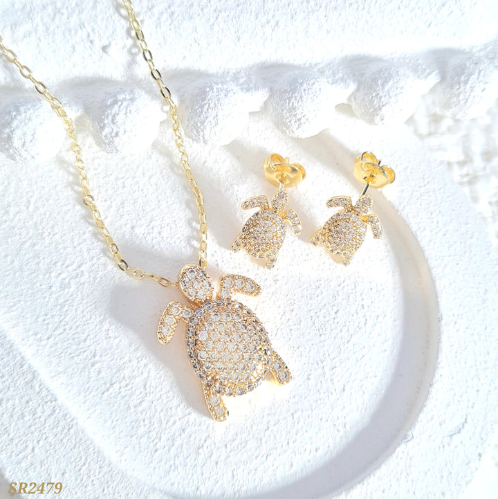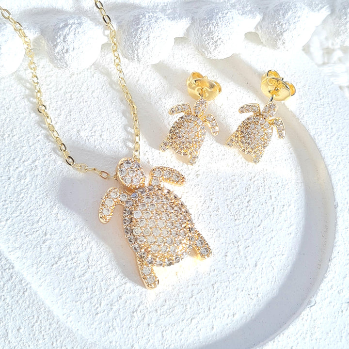 Set en rodio, dije con forma de tortuga, detalles en zircones y topos a juego