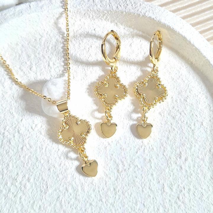 Set en rodio con dije en forma de trébol, corazón colgante y topos a juego