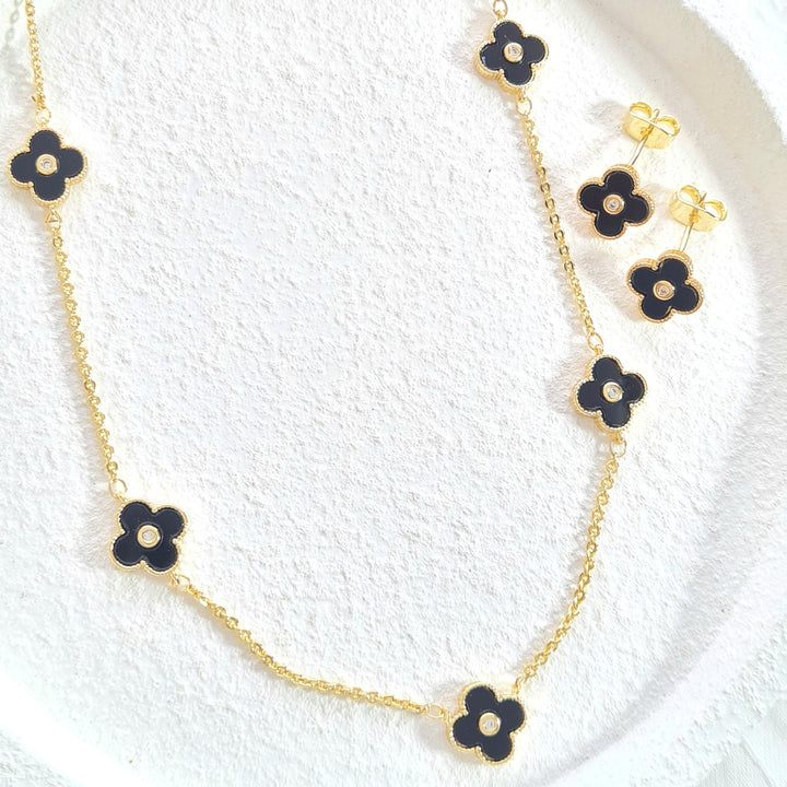 Set en rodio con dijes en forma de trébol negro con topos a juego