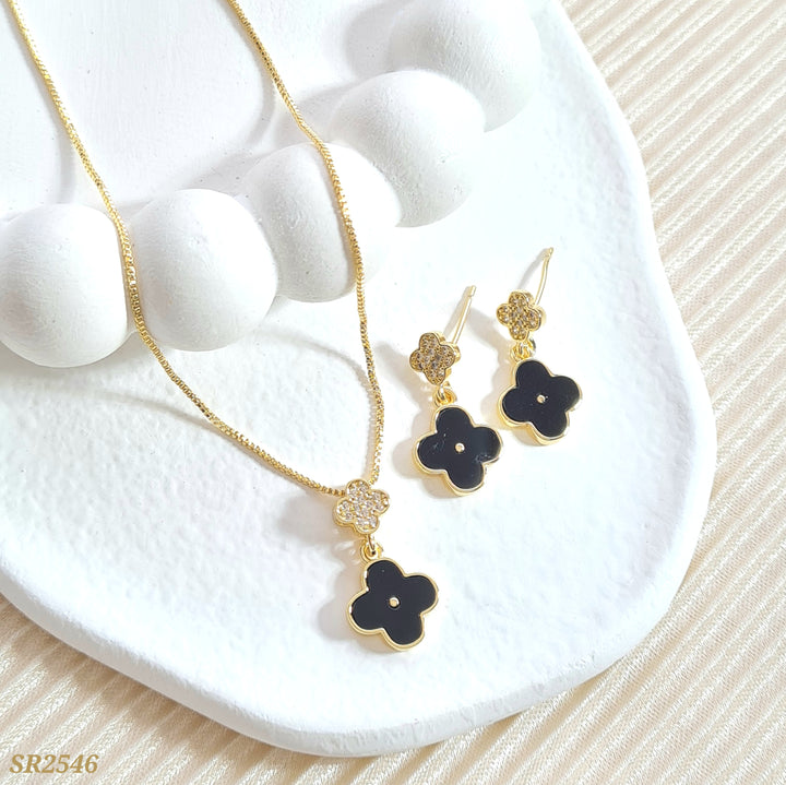 Set rodio cadena ajustable, dije trébol negro, detalles en zircones con topos a juego