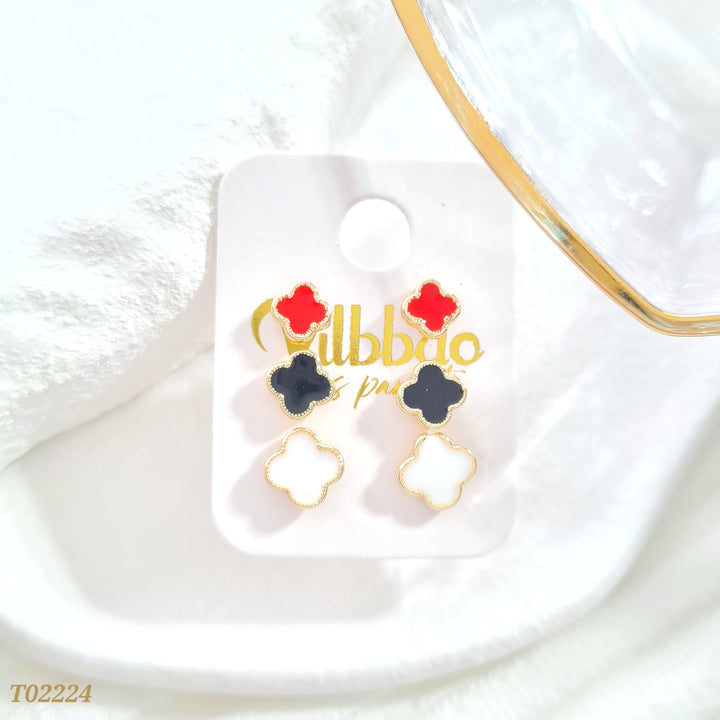 Set de topos en rodio con forma de trébol en tres tamaños colores rojo, negro y blanco