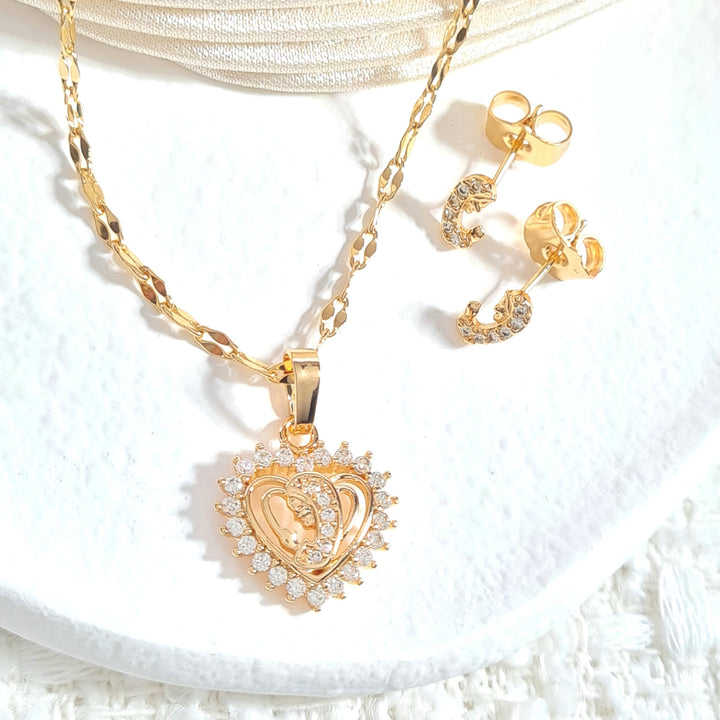 Set en rodio, dije en forma de corazón con imagen de virgen, zircones multicolor y topos zircon