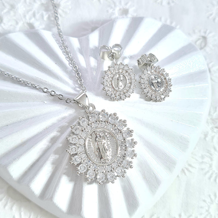 Set en rodio plateado, dije en forma de virgen, detalles en zircones con topos a juego