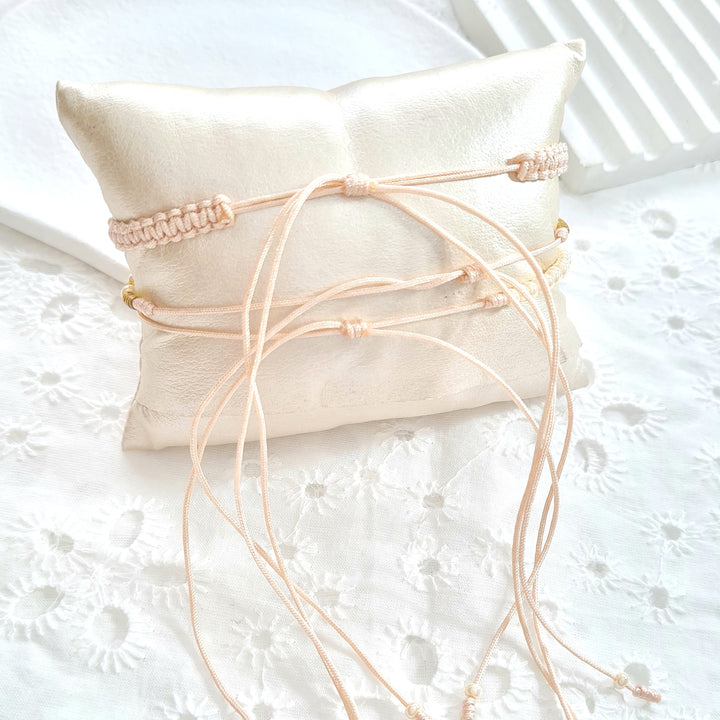Tobillera ajustable en hilo con dije de estrella, mostacilla beige, cadena tipo Gucc1 y detalles en oro goldfield