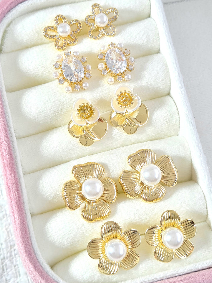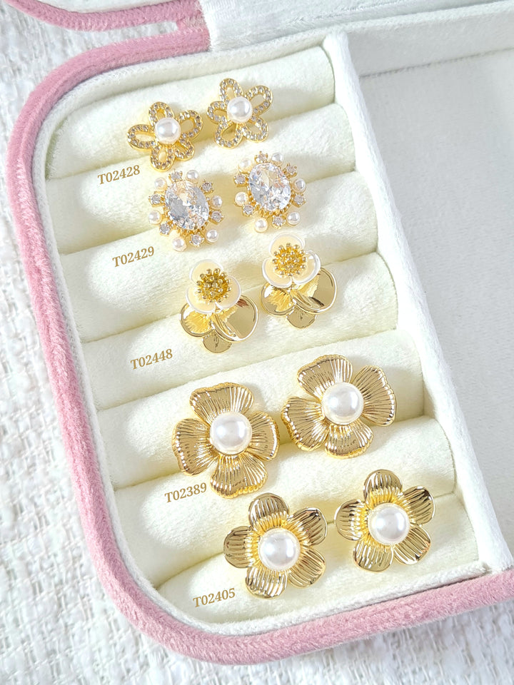 Topos en rodio con forma de flores con detalles en zircones y perlas
